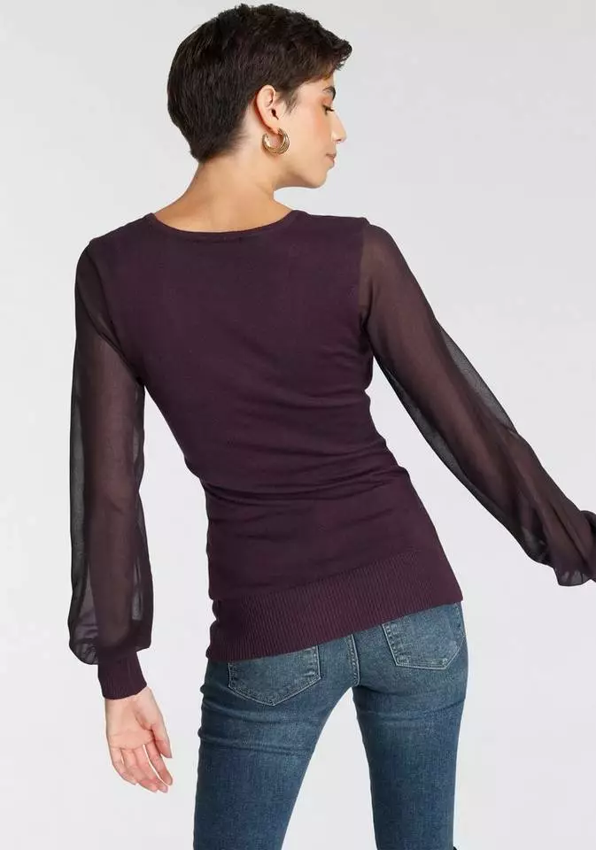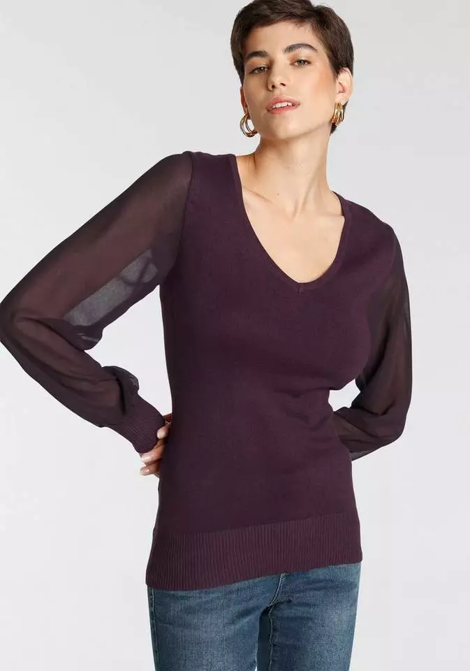 Feminine Eleganz mit besonderem Twist! Als modischer Lichtblick entpuppt sich der Pullover von Melrose im stilsicheren Materialmix-Design. Ausgestattet mit einem tiefen V-Ausschnitt besticht das betont feminine Strickoberteil mit unaufdringlichem Charme. Ein echtes Mode-Statement setzen die transparenten, voluminös ausgestellten und mit einem Rippbündchen abgeschlossenen Chiffon-Bischofsärmel in weiblicher Anmutung und voller luftiger Leichtigkeit. Entspanntes Wohlfühlen macht die softe Feinstrickqualität des Pullis leicht. Einen guten Geschmack beweist die Ergänzung eines Stretchminis, Schnürstiefeletten und einer Minibag. Der Pullover von Melrose trumpft als echtes Trend-Investment auf!
